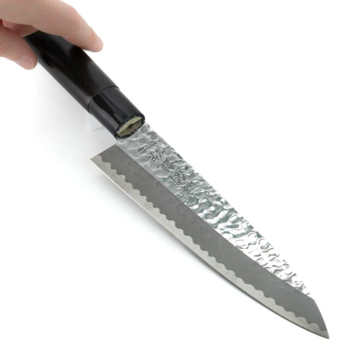 Sie bestehen aus dem rostfreien Edelstahl VG10 und zeichnen sich durch eine relativ hohe Schärfe, Flexibilität und Schneidleistung aus. Der Griff besteht aus wasserbeständigem Pakka-Holz und die Schneide ist mit einem traditionellem Schlagmuster bestückt.