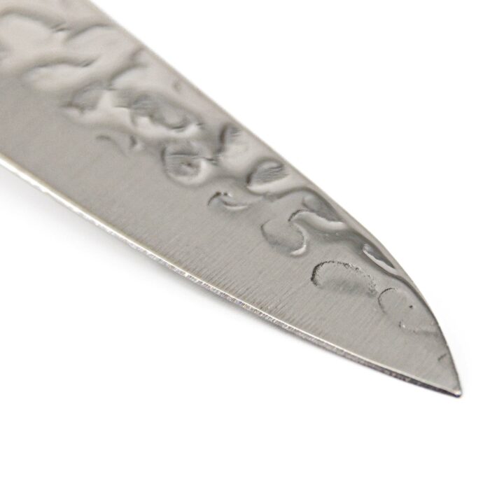 Sie bestehen aus dem rostfreien Edelstahl VG10 und zeichnen sich durch eine relativ hohe Schärfe, Flexibilität und Schneidleistung aus. Der Griff besteht aus wasserbeständigem Pakka-Holz und die Schneide ist mit einem traditionellem Schlagmuster bestückt.